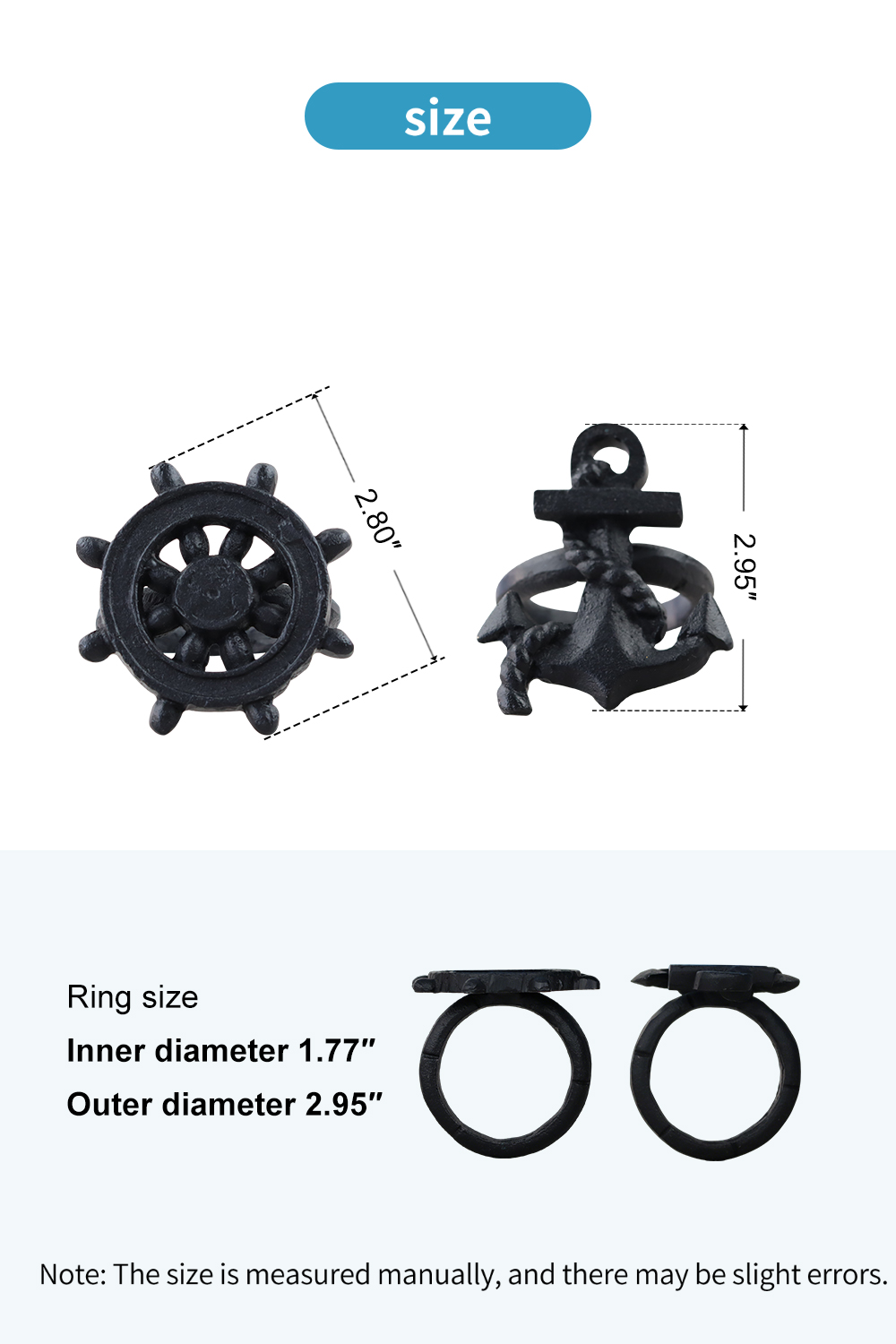 • [Packing & Overall Size] This set includes two nautical-style napkin rings: one anchor-shaped (2.95″ L × 2.44″ W) and one rudder-shaped (2.8″ diameter). Each ring has an inner diameter of 1.77″ and an outer diameter of 2.95″, fitting most napkins with ease